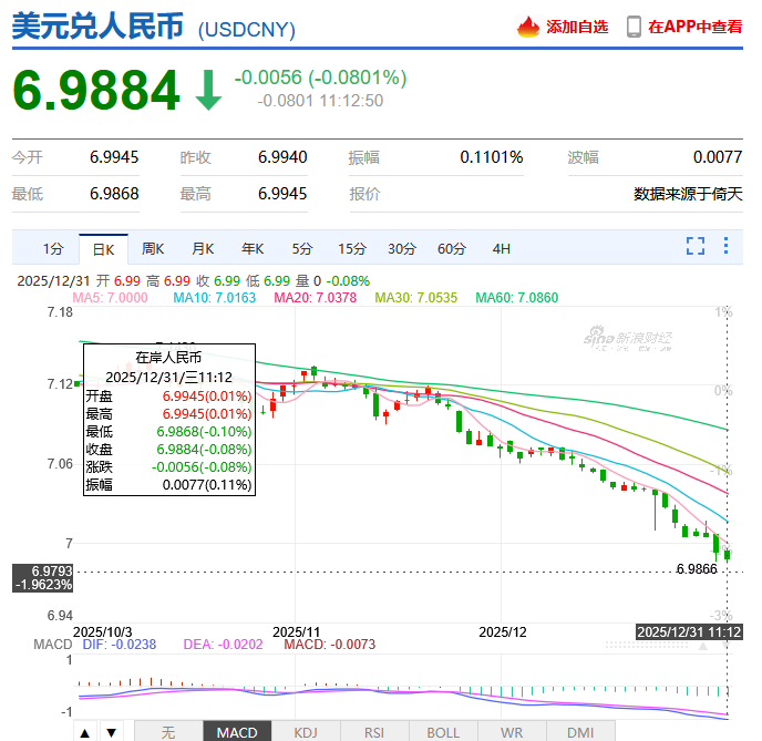 2025年12月31日,在岸人民币汇率突破7